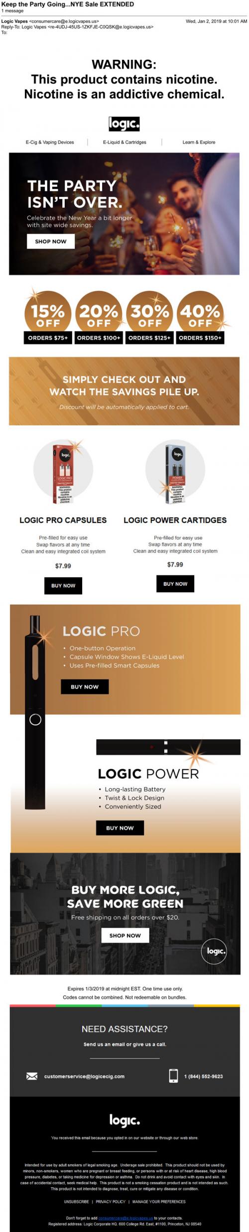 Logic email from January 2019 with savings to celebrate the New Year. Also promotes their Pro and Power products. Links to the brand website to purchase.