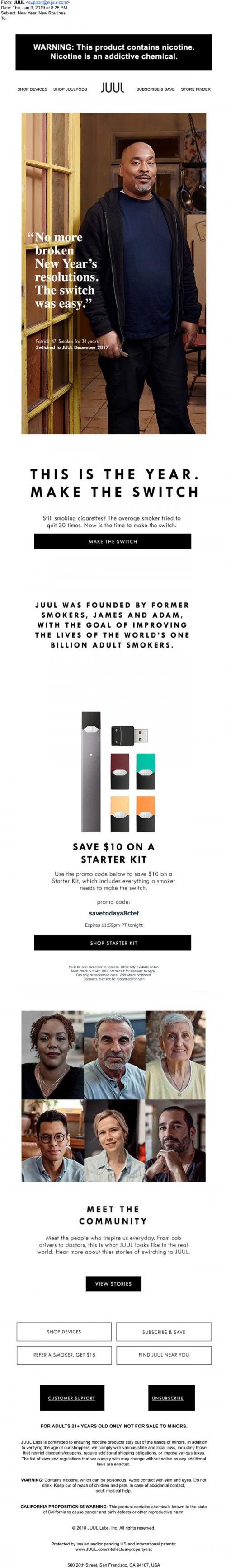 JUUL email in January 2019 promoting their brand as the perfect way to make the switch in the New Year. Includes a promo code to save money on a starter kit purchase through the brand website, and links to the Community section to hear customer stories about their experiences. Also links to the smoker referral program and the store locator.