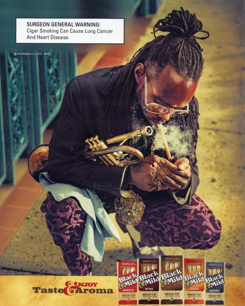 Magazine ad for Black & Mild promoting various wood tip cigar flavors, like sweets, wine, jazz, and casino. Image has a black trumpet player lighting a cigar on the sidewalk.