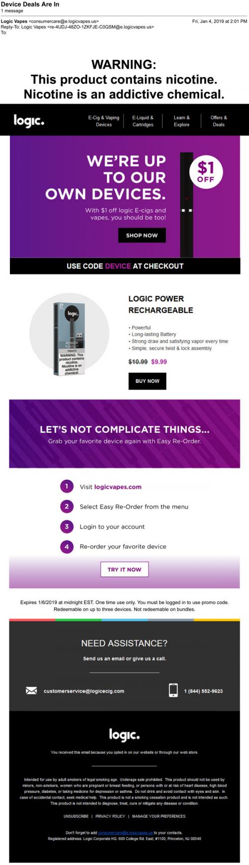 Email from Logic in January 2019 with a discount code to be used on purchases made through the brand website. Also promotes their Power rechargeable product and their "Easy Re-Order" program.
