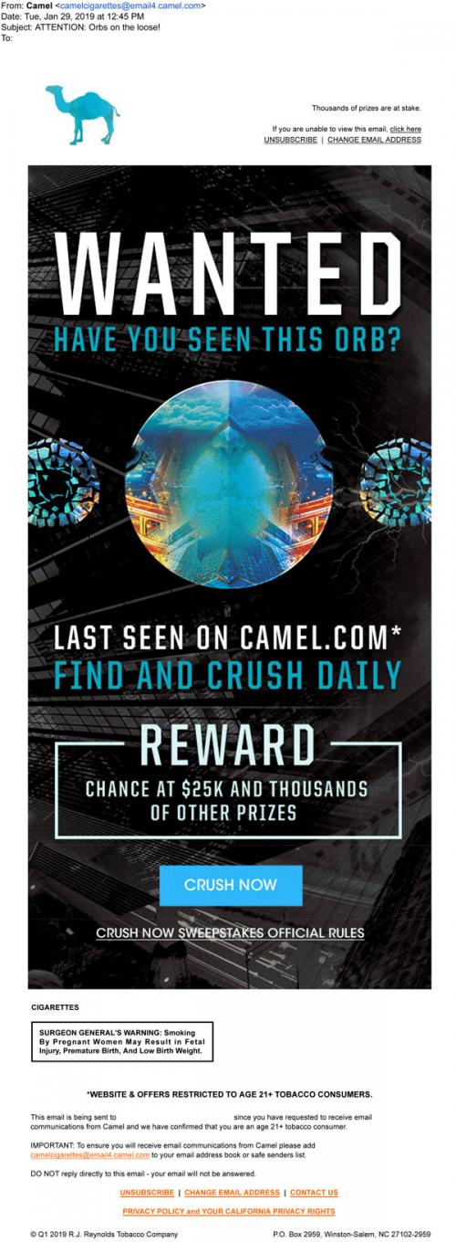 Email from Camel in January 2019 promoting the Crush sweepstakes, with daily orbs to "crush" on the brand website for chances to win.