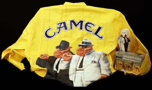 Camel windbreaker (yellow with Joe Camel images) free with purchase of 3 packs. Silver box featuring Joe Camel. other key words: young people.