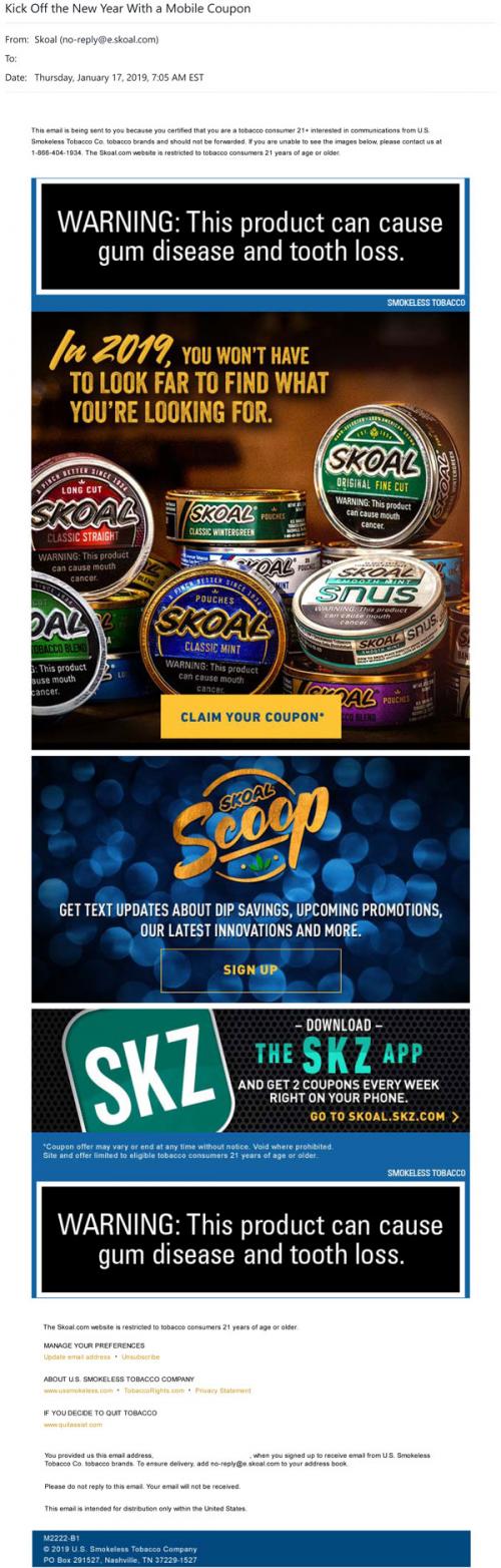 Email from Skoal in January 2019 that invites the recipient to claim a coupon for the New Year and links to the brand website to sign up for the Skoal Scoop to get text updates about what's going on with the brand, or to download the SKZ app to get mobile coupons.