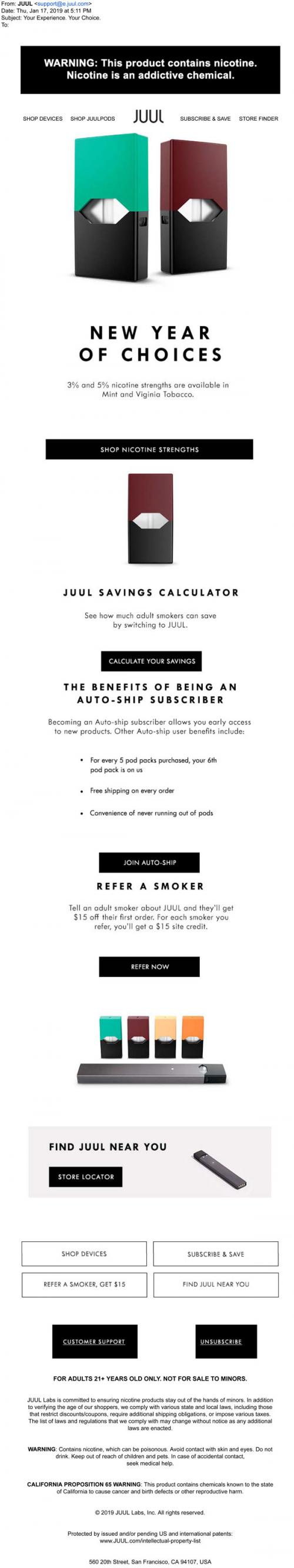 Email from JUUL in January 2019 promoting a "New Year of choices," mentioning the different nicotine strengths they offer in mint and Virginia tobacco pods. Also links to the brand website to use a savings calculator, learn the benefits of auto-ship, and to refer a smoker to get store credit, or use a store locator.