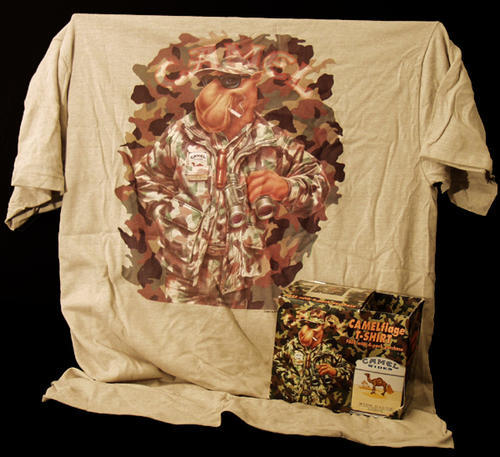Free camoflague t-shirt with purchase of 4 packs of Camel. Box features Joe Camel with camoflague background. Includes a card to build mailing list.