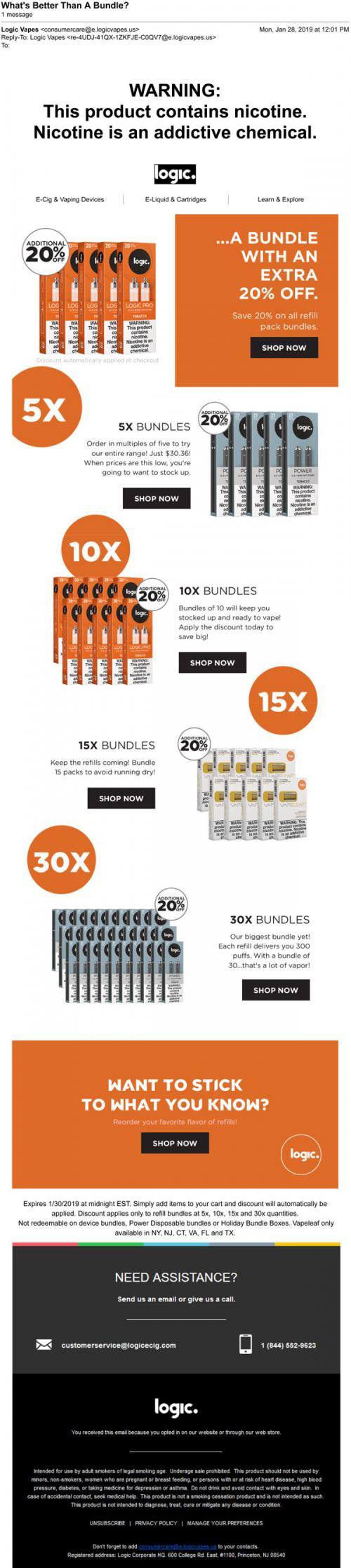Email from Logic in January 2019 promoting extra savings on their bundle offerings purchased through the brand website. Links to the online store to order.