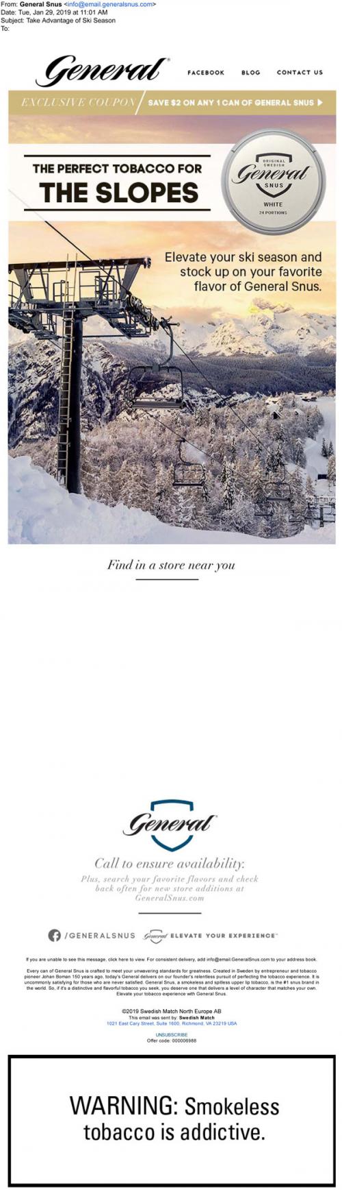 Email from General Snus in January 2019 promoting their products as "the perfect tobacco for the slopes." Includes a link to claim coupons from the brand website and a list of nearby retailers.