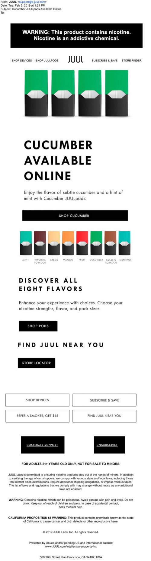 Email from JUUL in February 2019 reminding the recipient that cucumber and other flavored pods are all available to purchase online. Also provides links to refer a smoker and use a store locator.