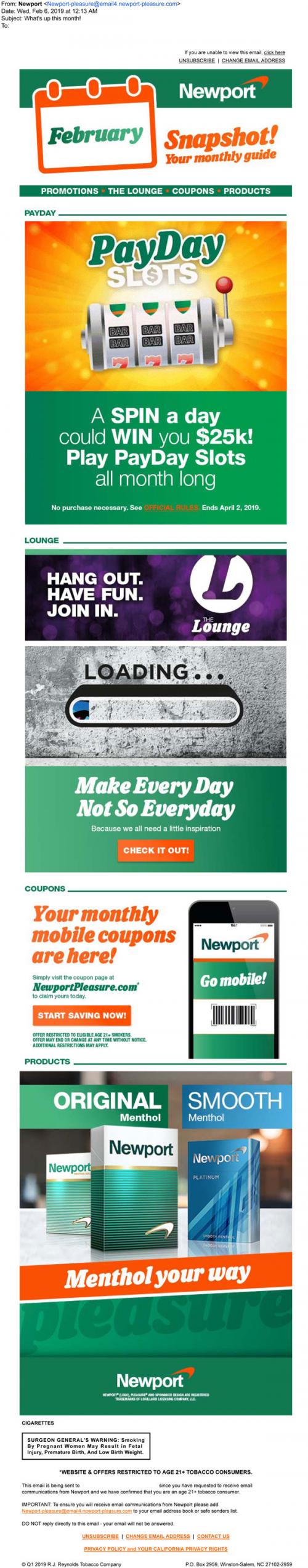 Email from Newport in February 2019 with an update about what is currently happening on the brand website this month. Promotes the PayDay Slots sweepstakes and the Lounge for special fun features, as well as mobile coupons. Includes imagery of both original and platinum menthol products.