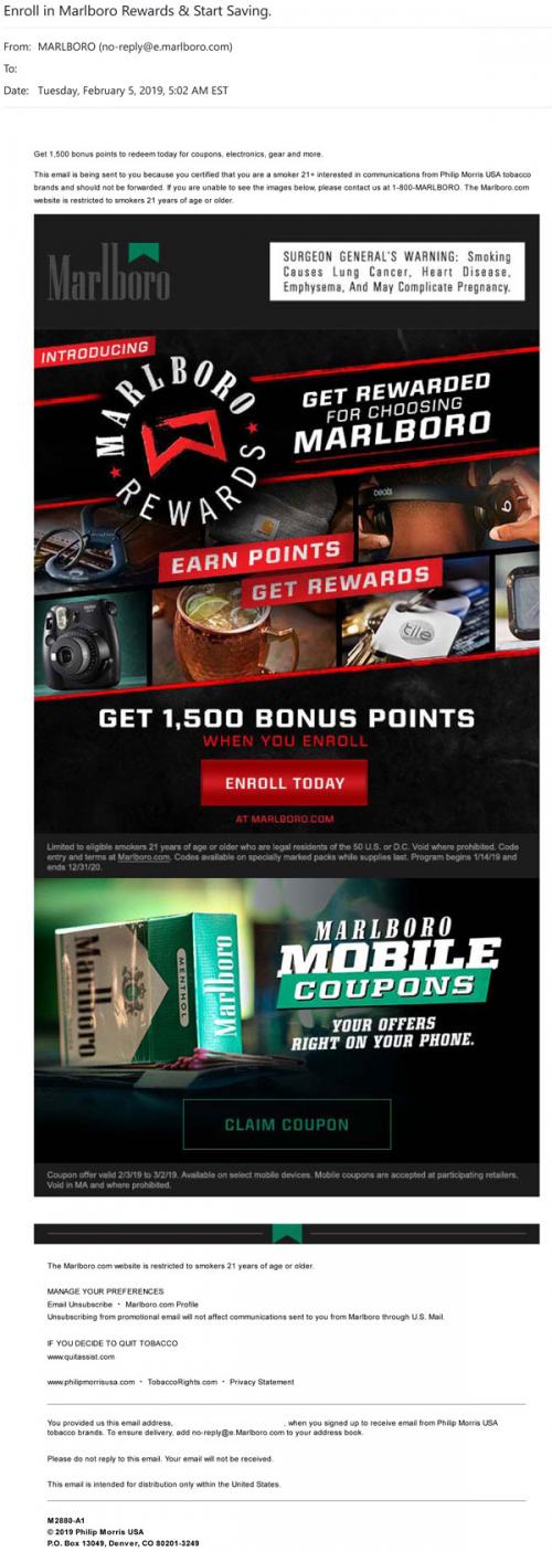 Email from Marlboro Menthol in February 2019 promoting the Rewards program with the promise of bonus points when enrolling, as well as a link to claim mobile coupons.