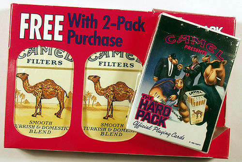 Free "Hard Pack Official Playing Cards" with purchase of 2 packs of Camels. Red box, features Joe Camel in night club clothes. most likely attractive product to youth and young people.