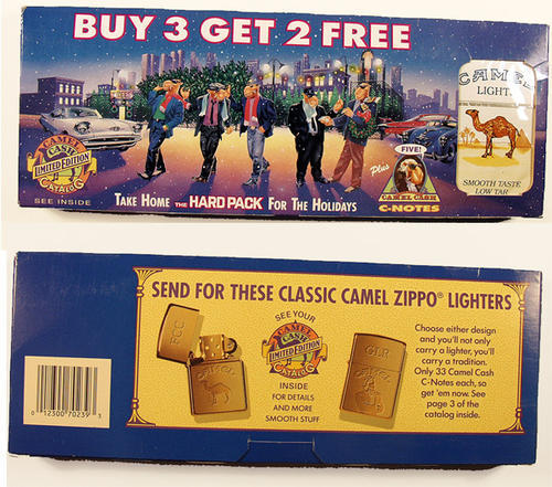Buy 3 get 2 free packs of Camel. Winter Holiday theme; blue box with Joe Camel in different poses. Offer for gold zippo camel lighter on back - redeemable with coupons