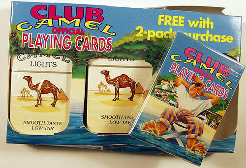 Free pack of playing cards with purchase of 2 packs of Camel Lights: Bright blue box, "Club Camel official playing cards" Joe Camel featured in beach scene.