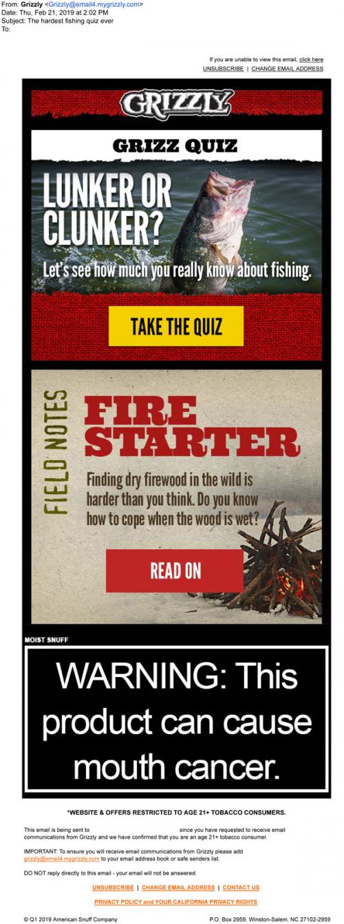 Email from Grizzly in February 2019 linking to the brand website to take a recent Grizz Quiz about fishing, and read a Field Notes article about starting fires.