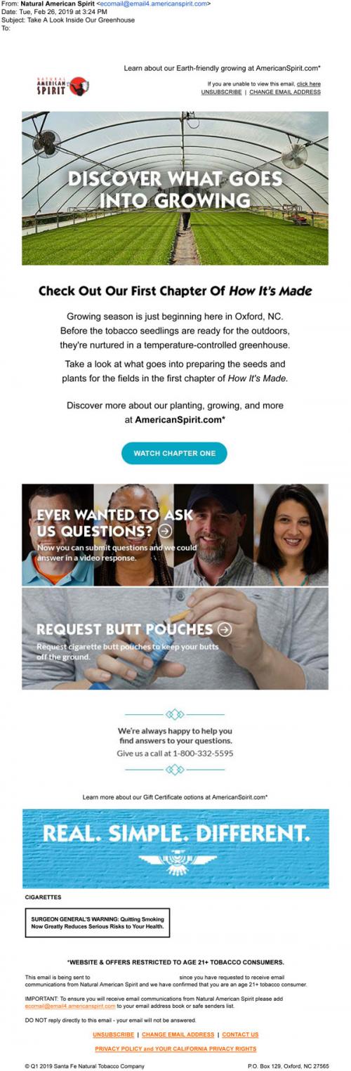 American Spirit email in February 2019 promoting the first chapter of the How It's Made video series, now available to watch on the brand website. Also links to the site to submit questions to brand representatives, request free butt pouches, or learn more about mobile coupons.