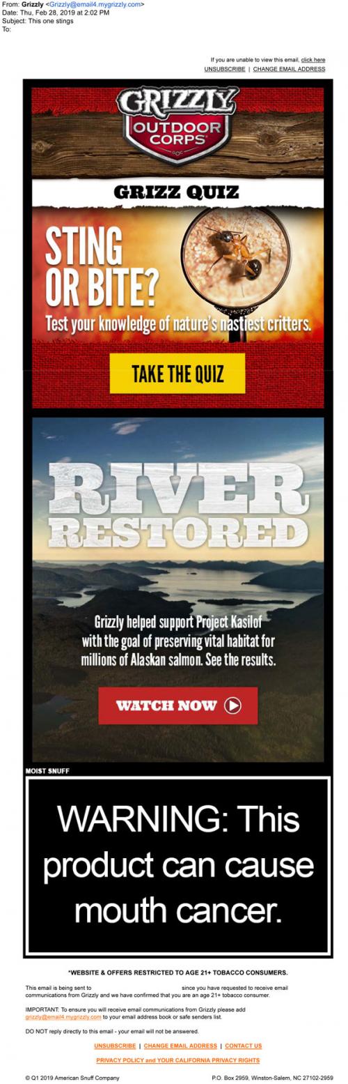 Email from the Grizzly Outdoor Corps in February 2019 with a link to take a recent Grizz Quiz on the brand website, or watch a video about how the brand worked to preserve habitat in Alaska.