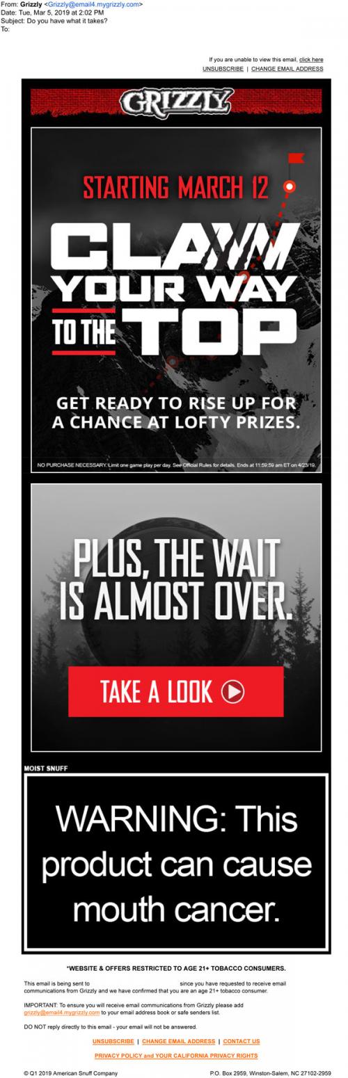 Grizzly email in March 2019 announcing an upcoming sweepstakes, Claw Your Way to the Top, for a chance to win prizes. Also links to the brand website to continue teasing an upcoming product reveal.