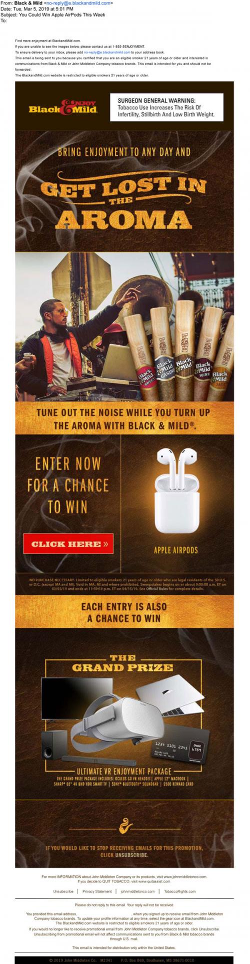 Black & Mild email in March 2019 promoting the Get Lost in the Aroma sweepstakes; this week is a chance to win a pair of Apple Airpods. Provides a link to enter and also includes an image of some flavored products they offer.