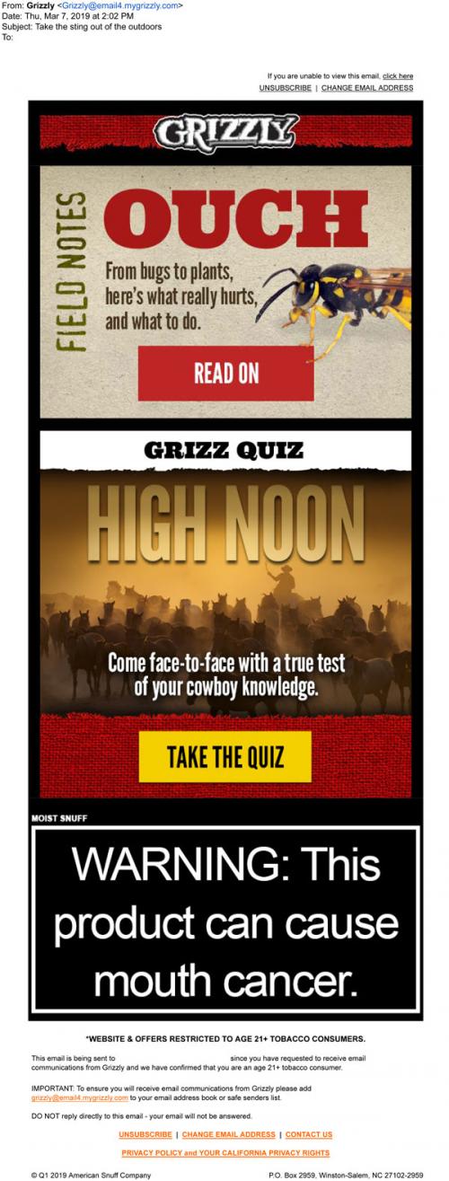 Email from Grizzly in March 2019 linking to the brand website to read a Field Notes article about stinging bugs and plants, and the most recent Grizz Quiz about cowboy knowledge.