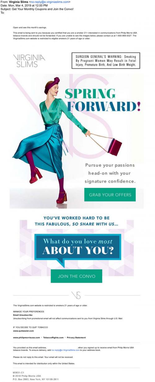 Email from Virginia Slims in March 2019 linking to the brand website to claim new monthly coupons and participate in a self-love discussion.