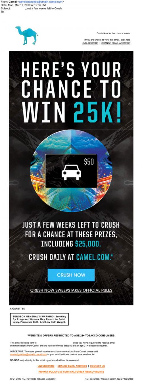 Email from Camel in March 2019 promoting the final weeks of the Crush Now sweepstakes, inviting the recipient to play daily to win on the brand website.