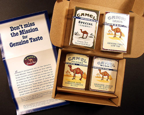 Direct mailing of sample packs of the varioius types of Camels. 4 packs. Coupon for buy 2 get 2 free of any style included.
