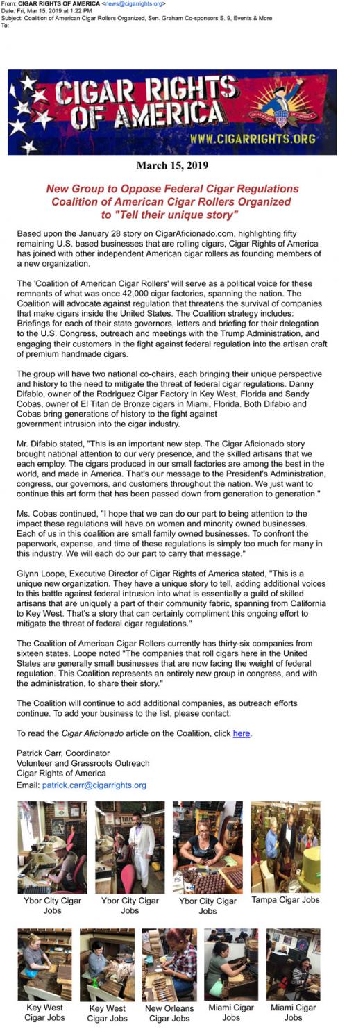 The Cigar Rights of America introduces a new organization they have formed in this March 2019 email, called The Coalition of American Cigar Rollers, that will be a "political voice" for cigar manufacturers. Shows images of some employees working at these businesses and includes a list of businesses that are part of the Coalition. Talks about senate support for new legislation and links to a petition to sign. Promotes upcoming events and cigar media, and solicits for memberships and donations.