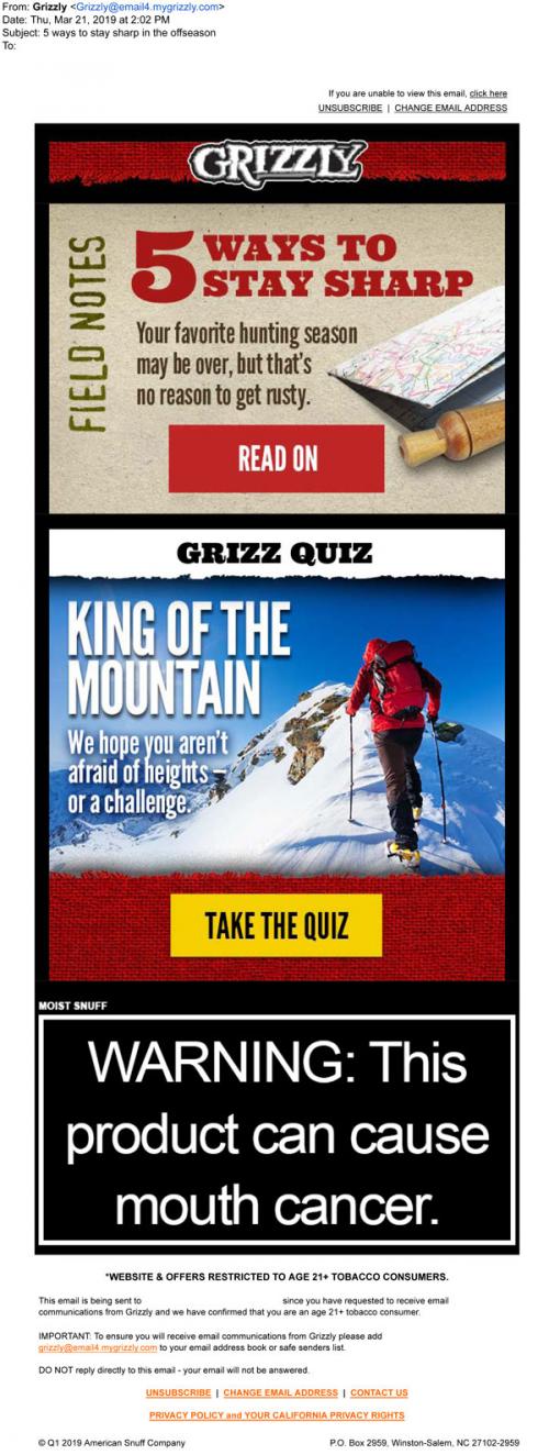 Email from Grizzly in March 2019 linking to a Field Notes article to check out about hunting, and a new Grizz Quiz to take.