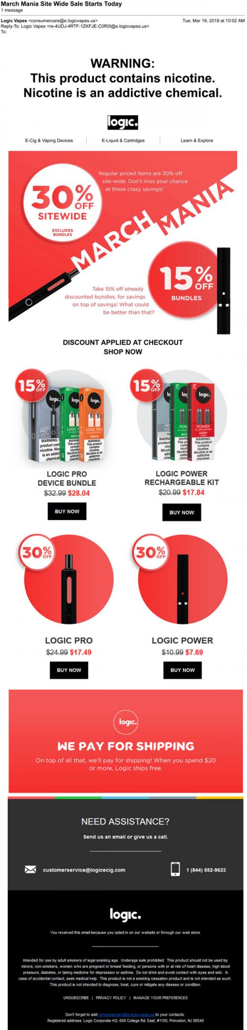 Email from Logic in March 2019 describing some discounts on products purchased through the brand website, like bundles and devices.