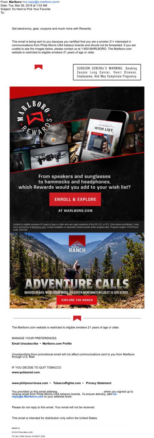 Email from Marlboro in March 2019 that invites the recipient to the brand website to enroll in the Rewards program and learn more about it. Also provides a link to check out the Ranch.