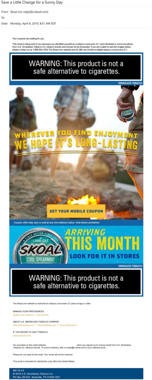 Email from Skoal in April 2019 promoting mobile coupons available through the brand website, as well as the new "cool spearmint" flavor available in stores this month.