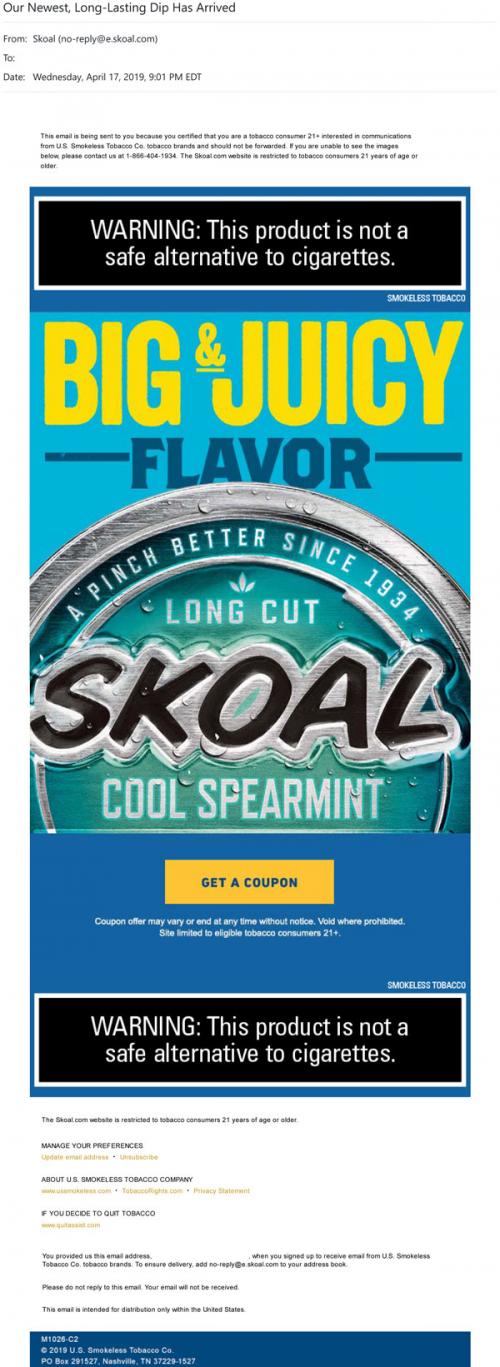 Email from Skoal in April 2019 providing a link to claim a coupon for their new cool spearmint product.