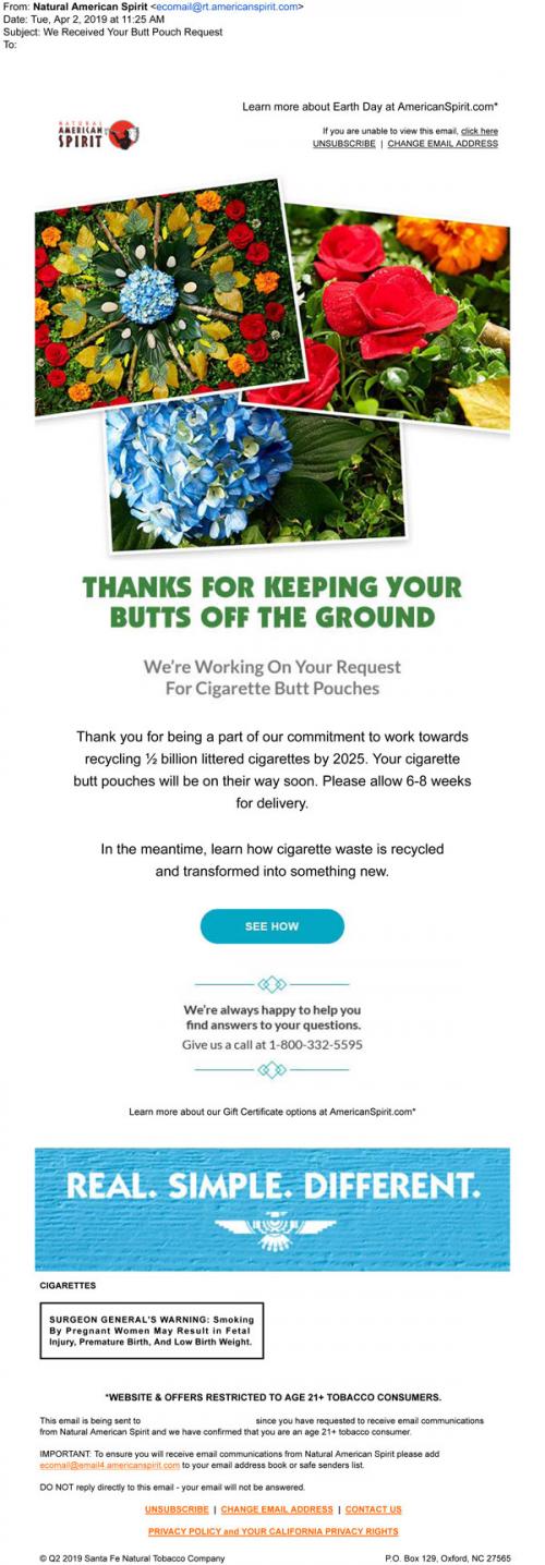 Email from American Spirit in April 2019 letting the recipient know that the cigarette butt pouches they requested are in the mail. Also includes an invitation to learn about recycling butts and claiming coupons on the brand website.