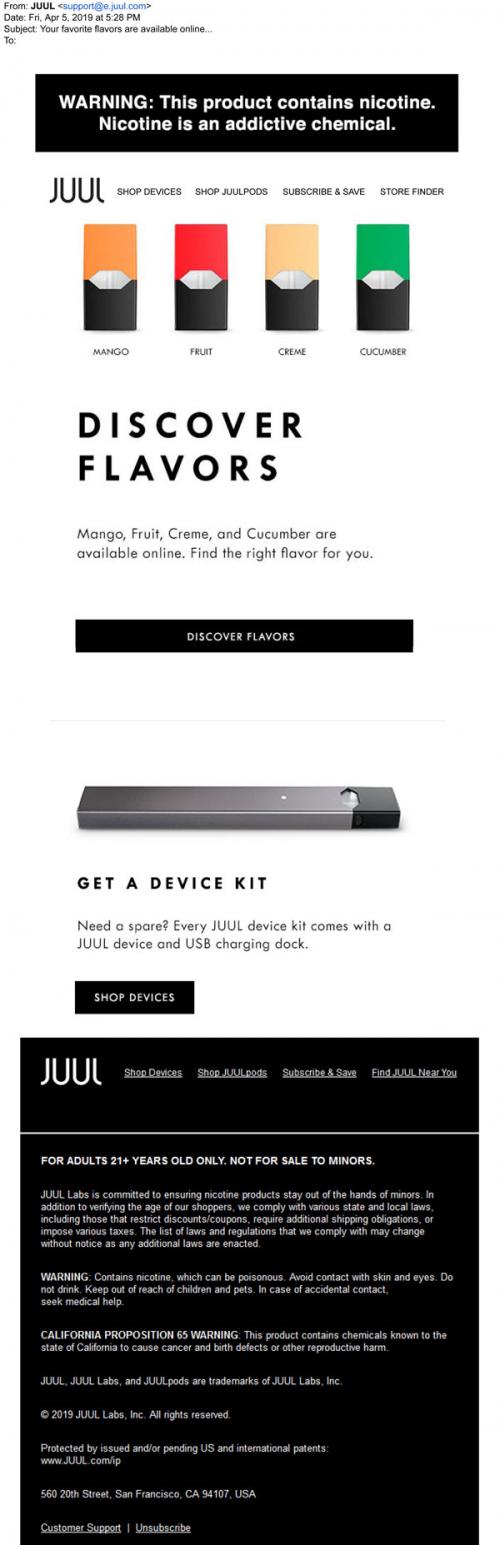 Email from JUUL in April 2019 reminding the recipient that flavored pods can be purchased through their brand website, along with device kits.