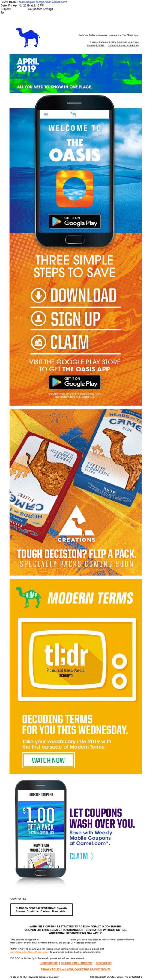 Email from Camel in April 2019 that promotes the Oasis app, which allows customers to claim mobile coupons. Also announces new pack designs and an episode of Modern Terms to watch on the Hump.