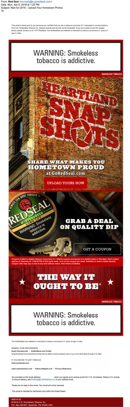 Email from Red Seal in April 2019 inviting the recipient to share photos of their hometown on the brand website. Also includes a link to claim a coupon.