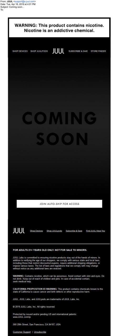 Email from JUUL in April 2019 announcing a new product coming soon, that only subscribers to their auto-ship program will have access to. Links to the brand website to join.
