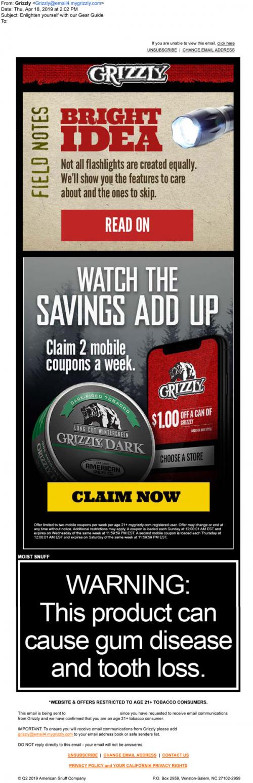 Grizzly email in April 2019 promoting a new Field Notes article to read on the brand website, as well as a chance to claim weekly mobile coupons.