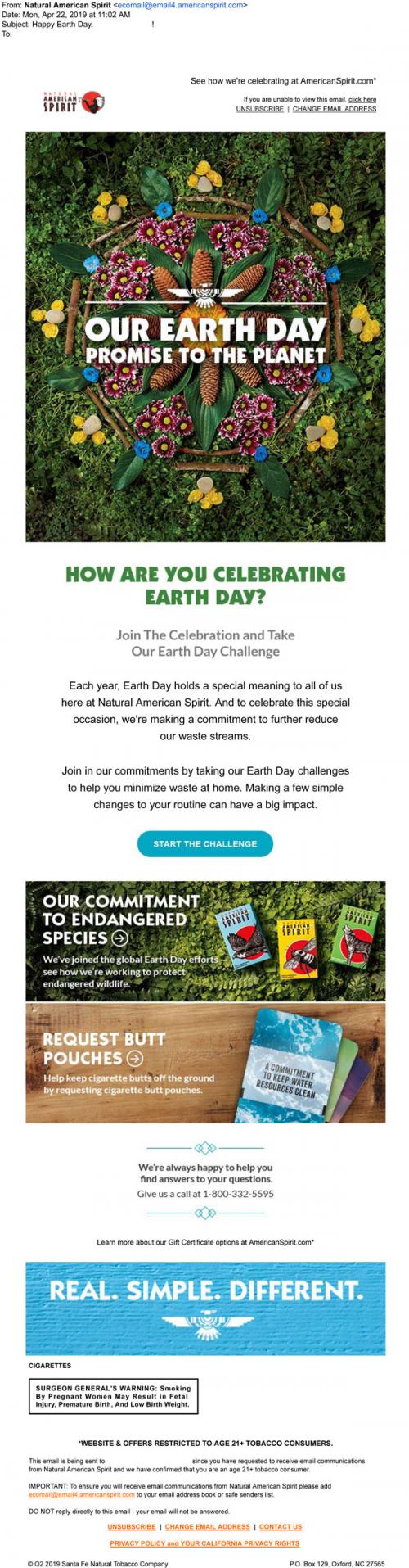 Email from American Spirit in April 2019 that invites the recipient to celebrate Earth Day by learning tips on the brand website to be more environmentally friendly and share the brand's commitment to reducing waste. Also shows new pack designs to help support endangered wildlife, and reminds the recipient to request butt pouches and coupons.