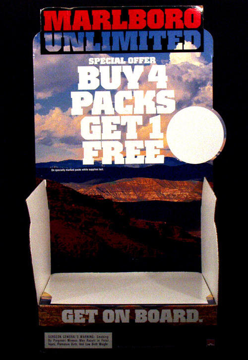 Marlboro point of sale sign. "Buy 4 packs get 1 free" Picture of western landscape and large red train. "Get on board" "The train, the trip, the gear."