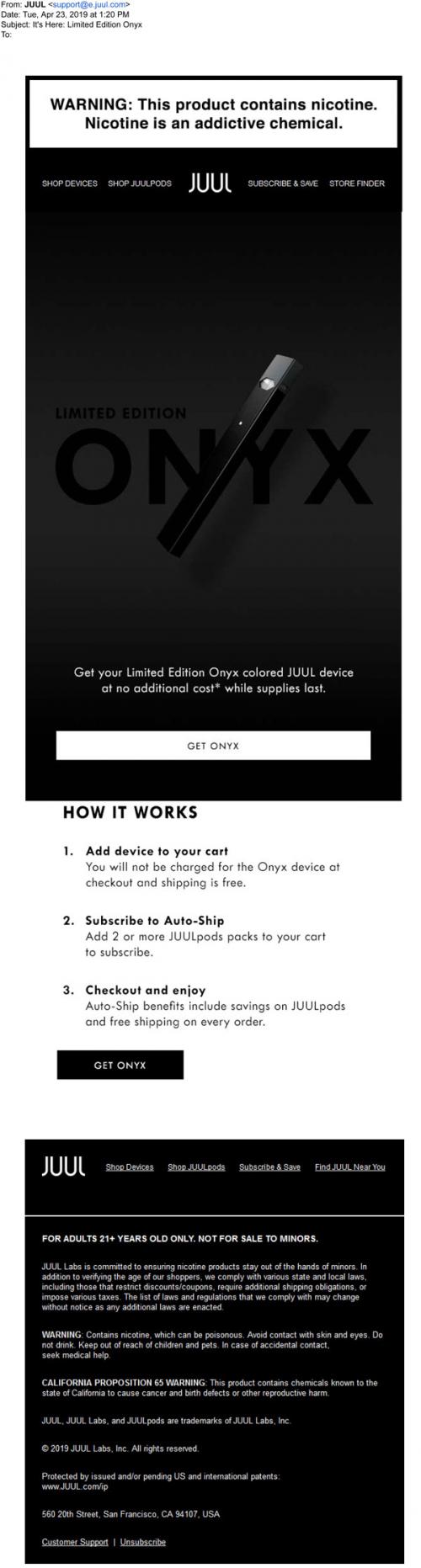 Email in April 2019 from JUUL promoting a free limited edition Onyx device when joining their auto-ship program.