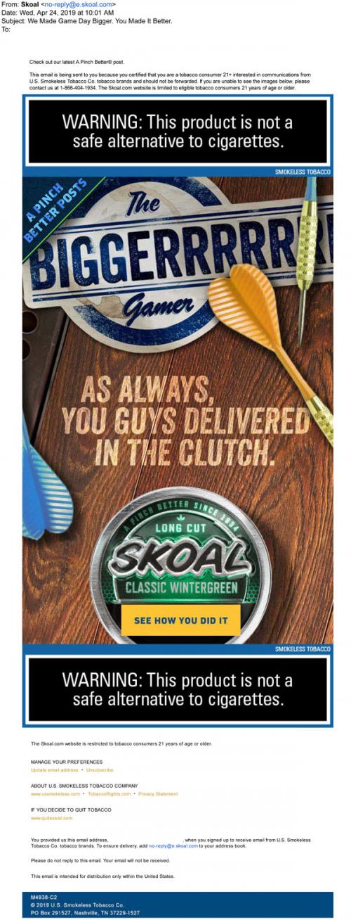 Skoal email received in April 2019 with an invite to learn more about The Bigger Gamer on the brand website.