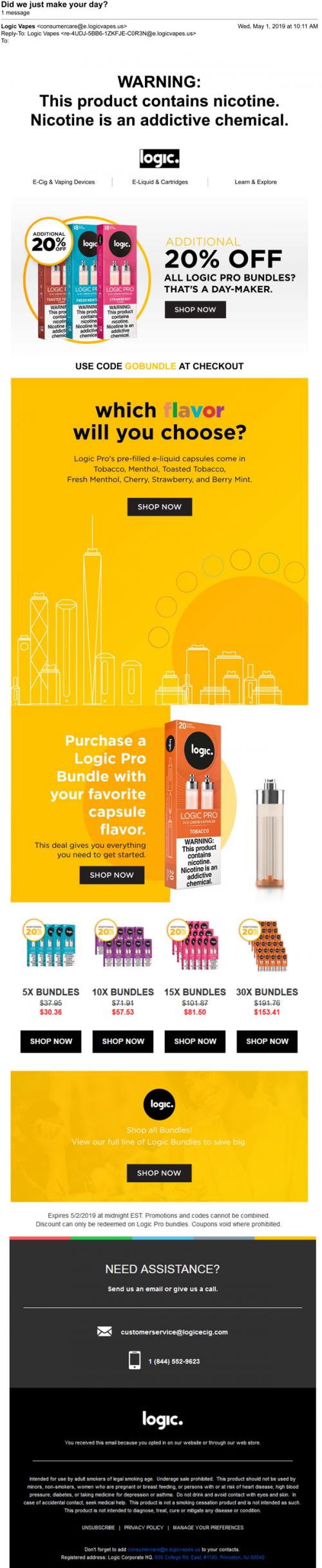 Email from Logic in May 2019 promoting a bundle sale on the brand website, with emphasis on flavors.