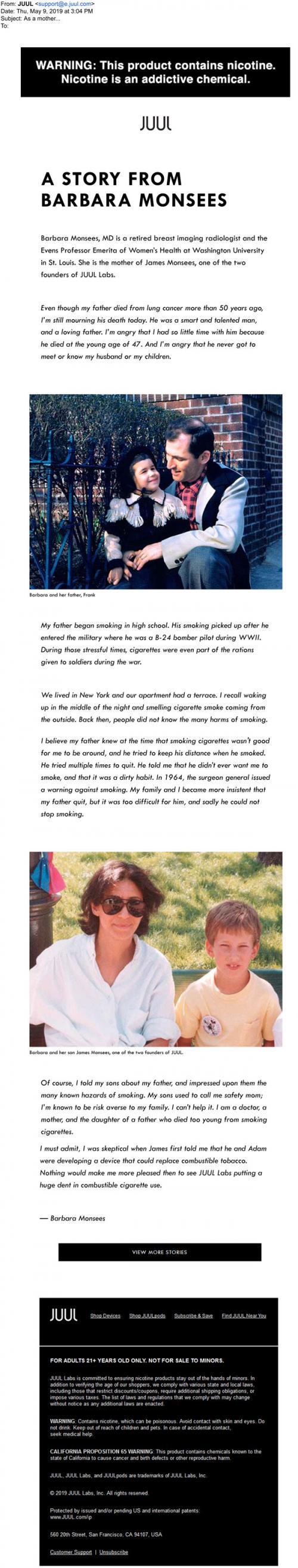 Email from JUUL in May 2019 featuring a story from the mother of one of the brand creators and family circumstances that inspired him. Links to the brand website to read more stories.