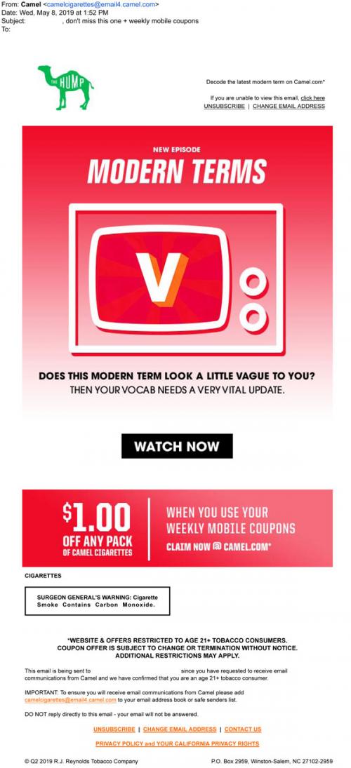 Camel email in May 2019 promoting the newest episode of Modern Terms to watch, with a link to claim weekly mobile coupons.