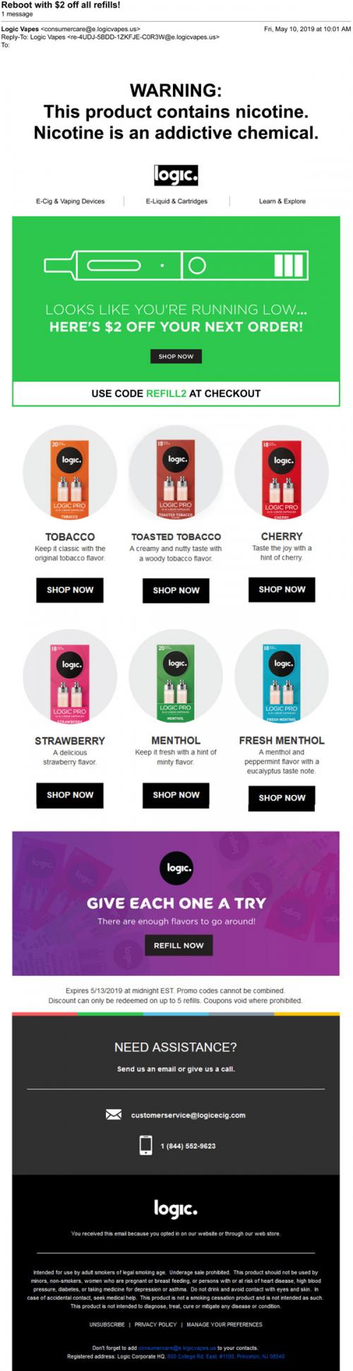 Email from Logic in May 2019 promoting a discount coupon to use when making a purchase through the brand website, while emphasizing the flavors they offer.
