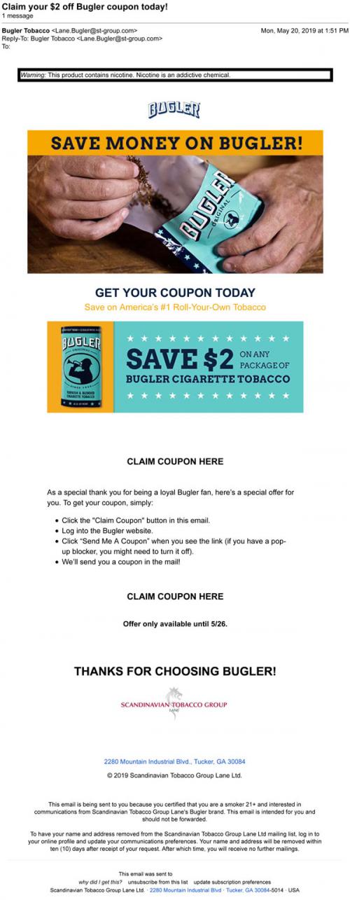 Email from Bugler in May 2019 with a link to claim a coupon for a discount on rolling tobacco.