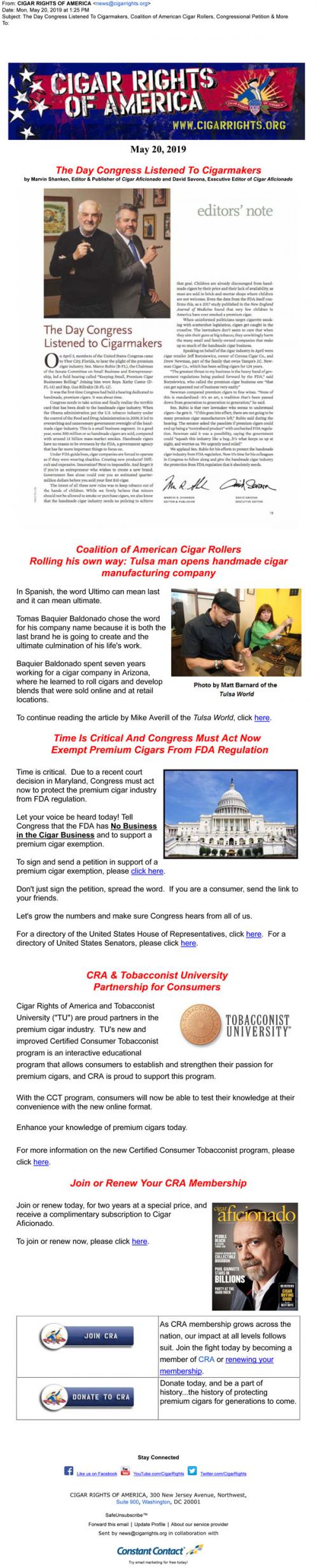 Rights of America in May 2019 announcing news about current cigar