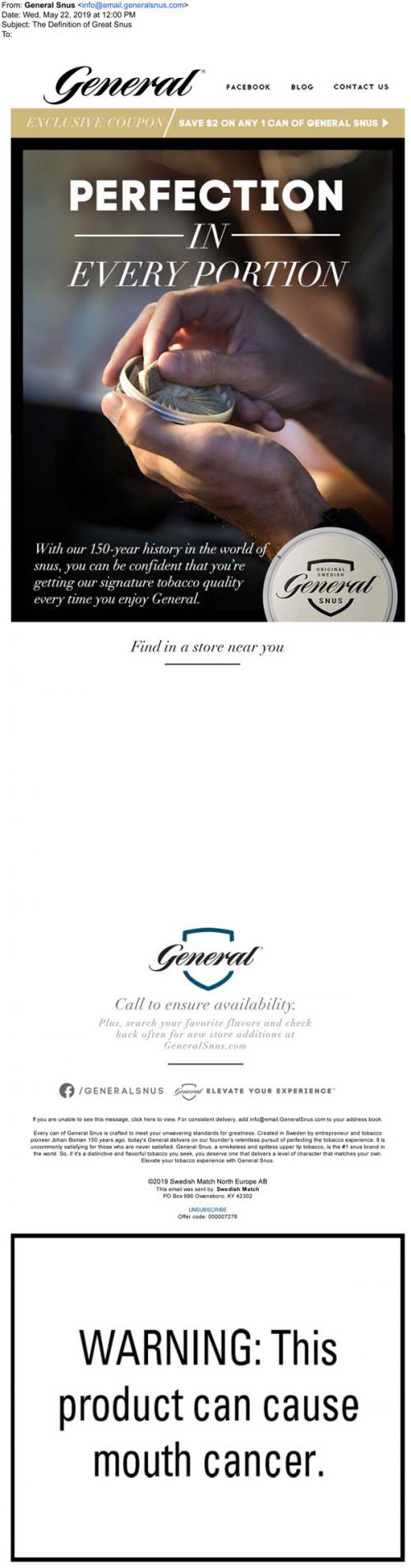 Email from General Snus in May 2019 linking to the brand website to claim a coupon, with some retail locations listed.