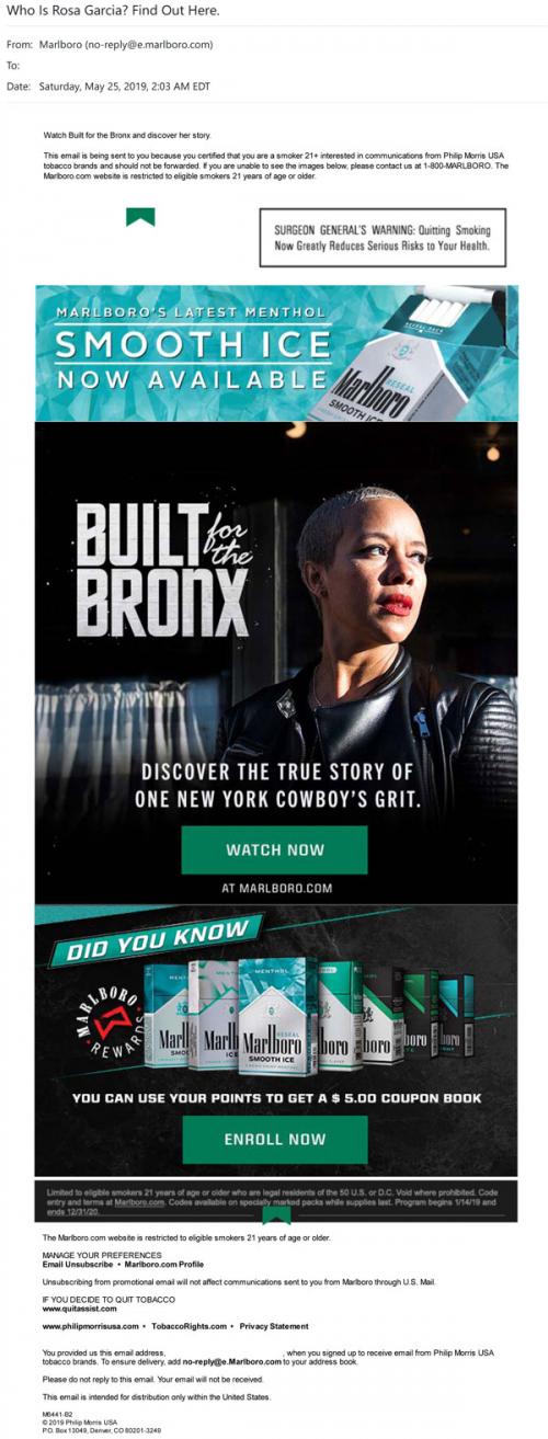 Marlboro Menthol email in May 2019 promoting a video called Built for the Bronx, that covers the story of a woman in the city. Also reminds the recipient that Rewards points can be exchanged for coupons. Promotes the newly available smooth ice menthol product.